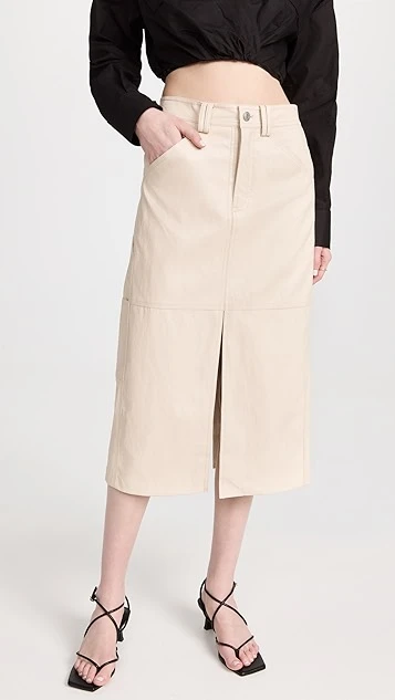 Crafted from luxe vegan leather, this premium A.L.C. midi skirt features both a front and back slit, as well as a high rise waist that feels equally timeless and modern.