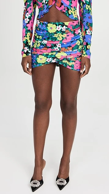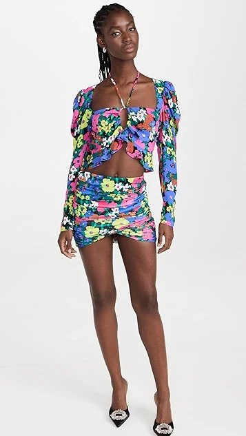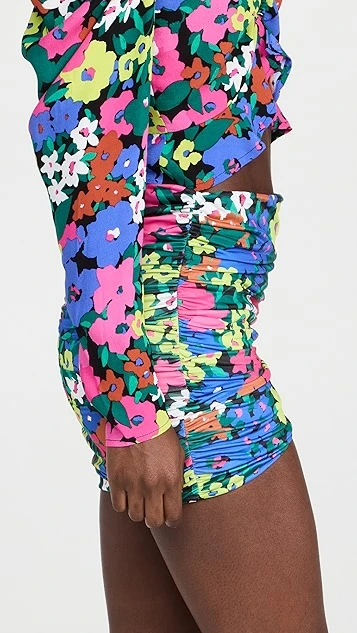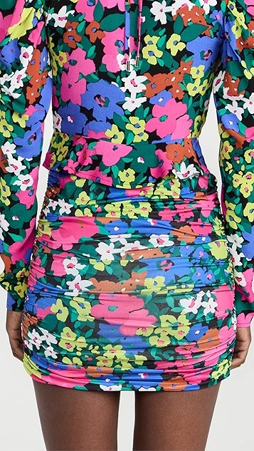 Fluid ruching accentuates the formfitting silhouette of this AFRM miniskirt, which feels in keeping with the brand’s dedication to eye-catching style thanks to a neon-tinged floral pattern.
