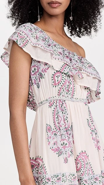 - Elastic, one-shoulder neckline with ruffled trim
