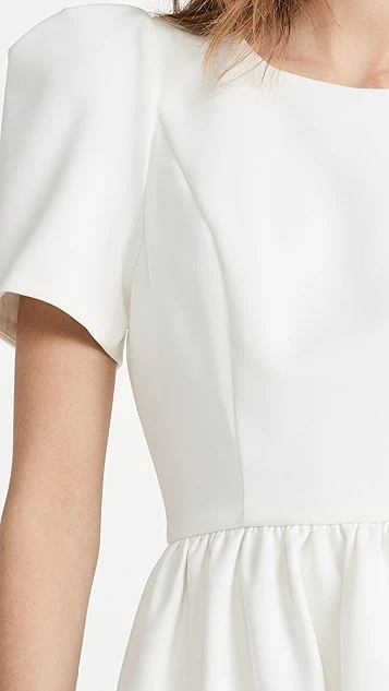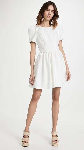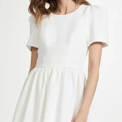 This sophisticated Black Halo mini dress is crafted from light-colored crepe, and juxtaposes a tidy, tee-style upper with a subtly flared skirt.