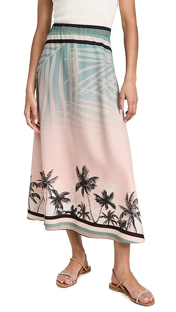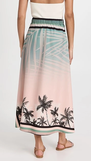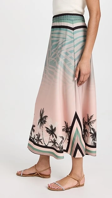 Palm leaf and palm tree prints detail this silky and summery Chen Burkett skirt. Vivid stripes add an extra touch of emphasis to the waist and hem.