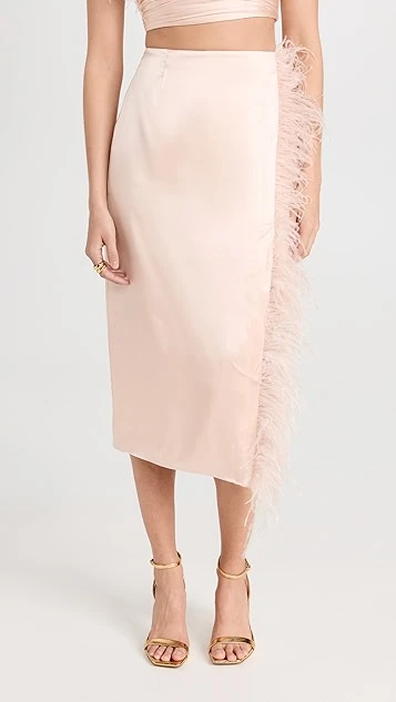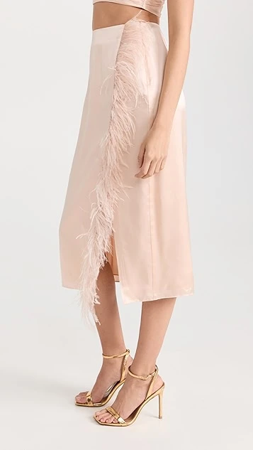 - Ostrich feather trim and knee-high slit