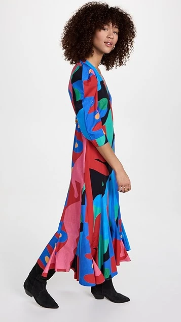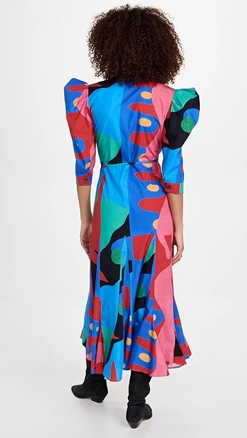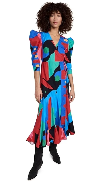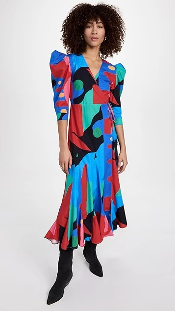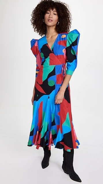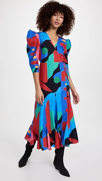 An extremely versatile addition to your current wardrobe, this De Loreta wrap dress is crafted in poplin, and features puff sleeves and a godet hem for a romantic take on a timeless silhouette. Boots, sneakers, and sandals are all good go-withs for this breezy midi.