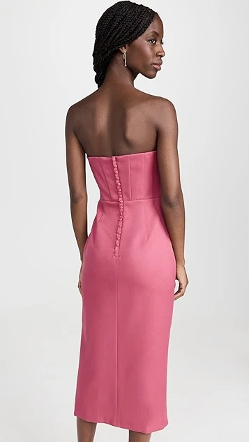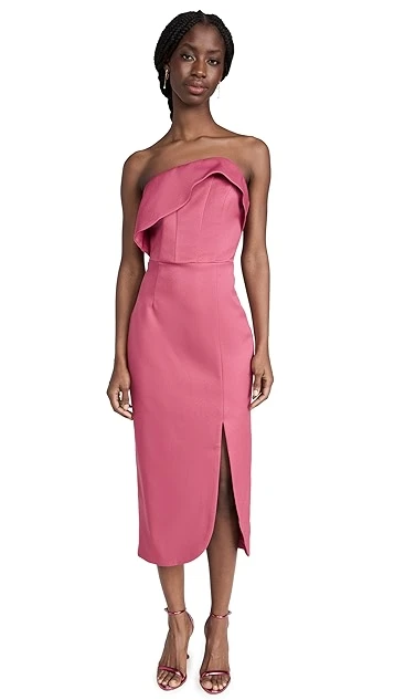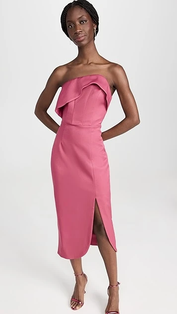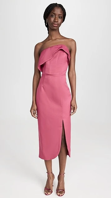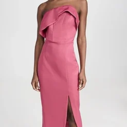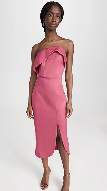 A figure-skimming Elliatt dress in silky, shimmery satin, accented with an asymmetrical overlay at the strapless neckline. A gently curved front slit relaxes the hem.