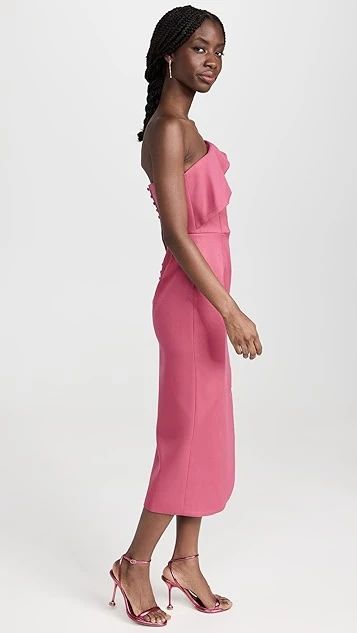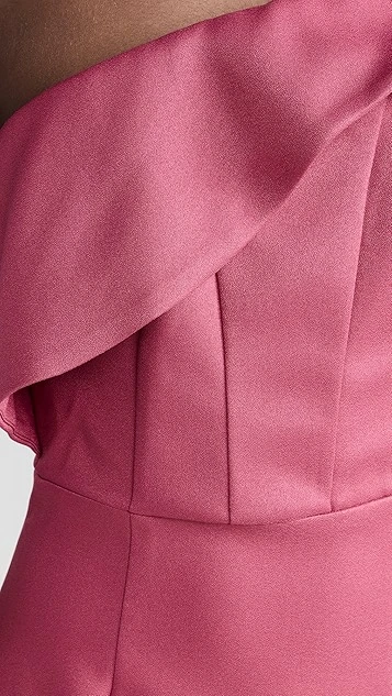 - Asymmetrical strapless neckline with fold-over flounce trim