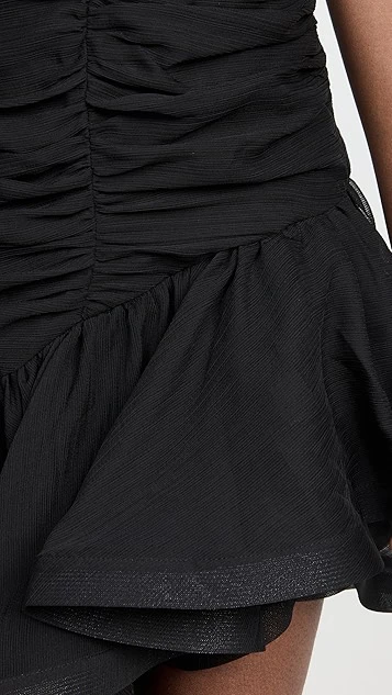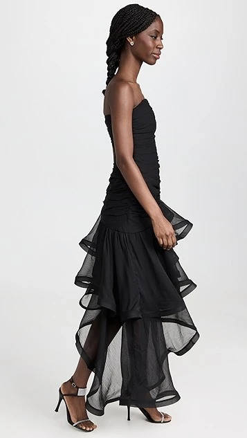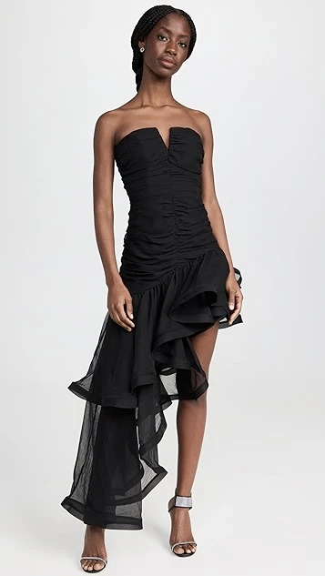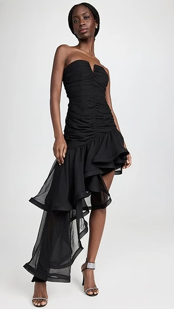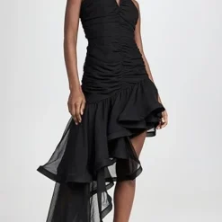 - Asymmetrical high-low hem with structured ruffle trim