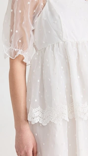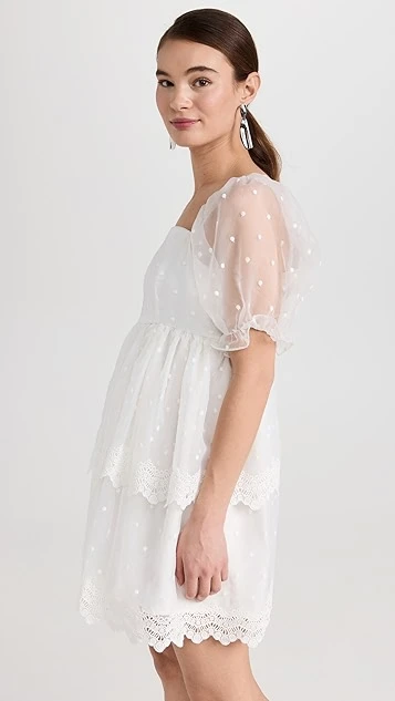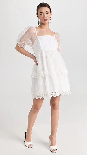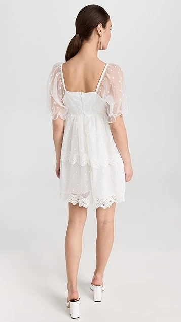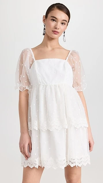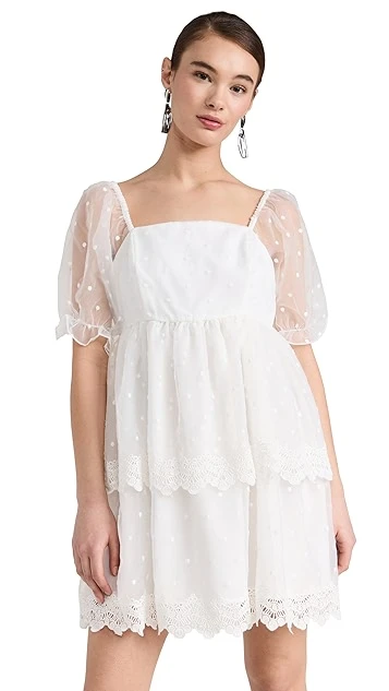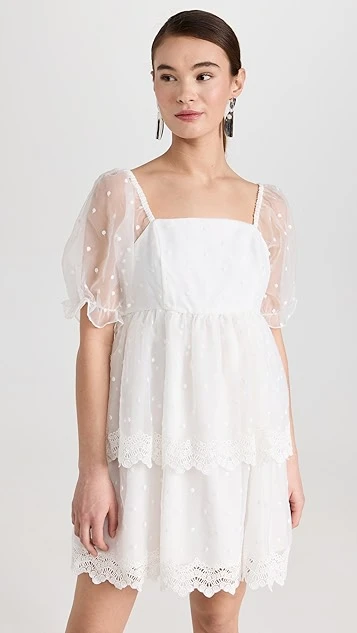 Designed with a classic babydoll silhouette and crafted from crisp organza, this endless rose white mini dress features a wealth of dreamy details, like flocked dot patterning and tonal lace trim. White sandals and drop earrings are all you’ll need to round out your special-occasion look.