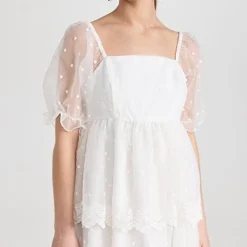 - Embroidered polka-dot pattern and scallop eyelet trim