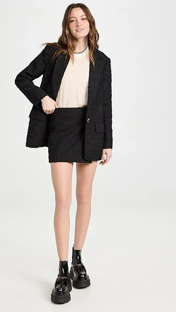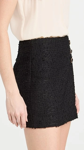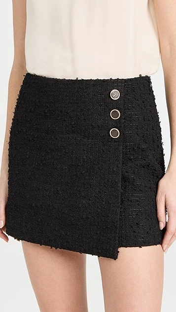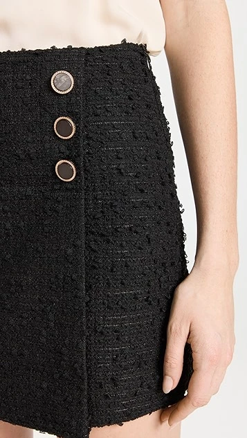 A tidy endless rose miniskirt in classic black tweed, accented with a trio of polished buttons and a wrap front that accentuate the polished feel of the piece.