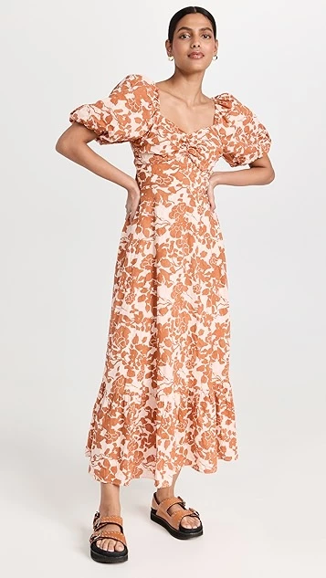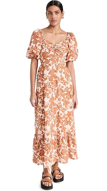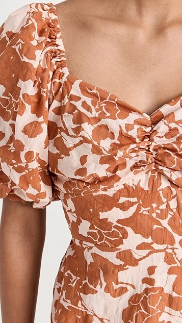 A monochrome floral print covers this elegant yet everyday-friendly English Factory dress. A sweetheart neckline and puff sleeves accentuate the romantic feel of the piece.