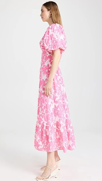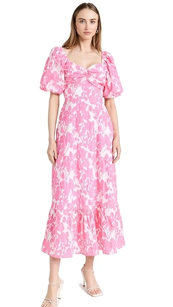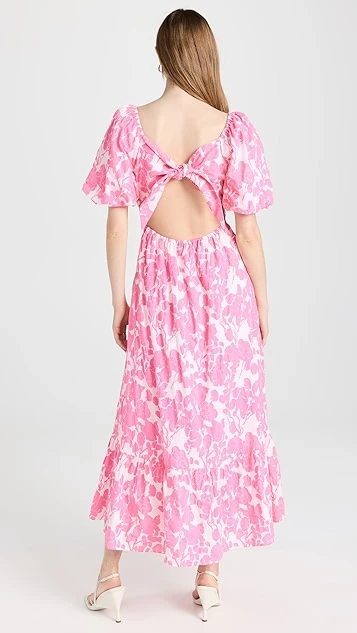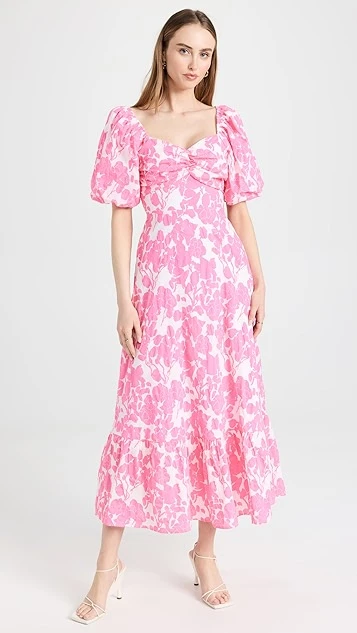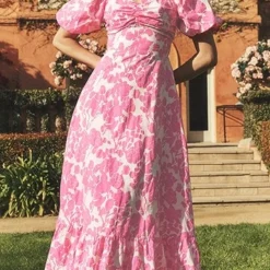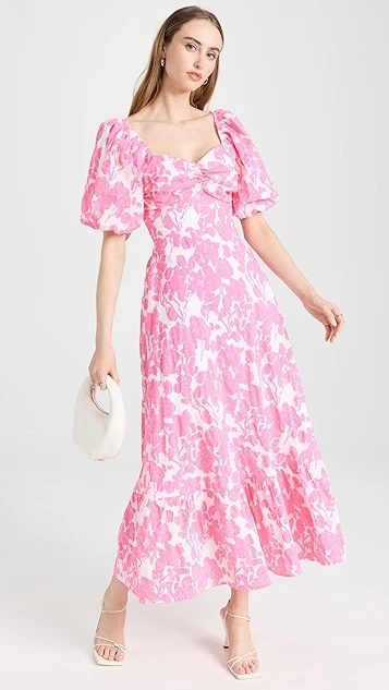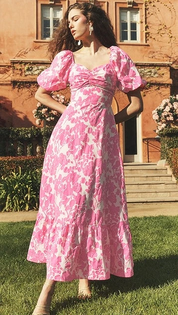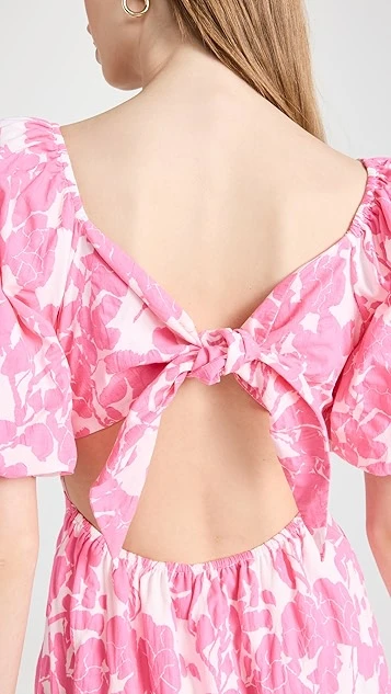 Make the most of your next springtime occasion in this lovely English Factory dress, which perfectly suits the season thanks to a bright-pink floral print. An open back and a touch of gathering at the sweetheart neckline add to the romantic feel of this silhouette.