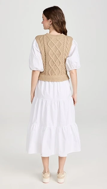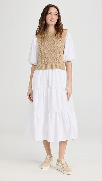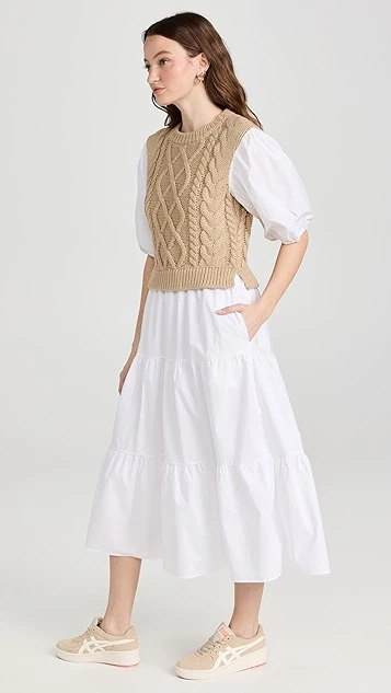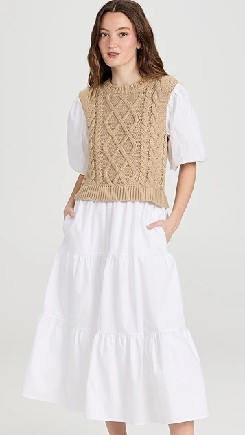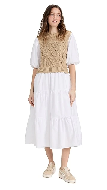 A charming take on mixed media style for your everyday wardrobe. This English Factory midi dress combines a cable-knit bodice with voluminous white poplin to unique effect. Subtle sneakers and kitten heels will both work well with this piece.