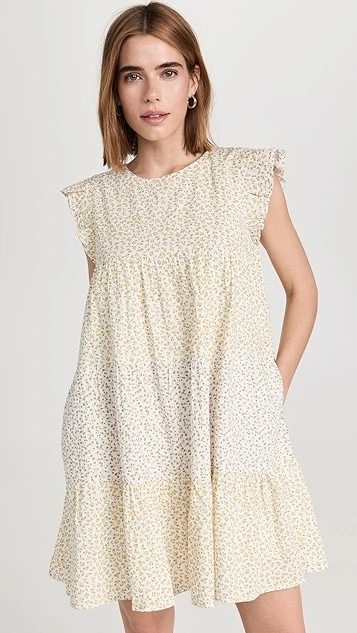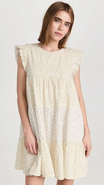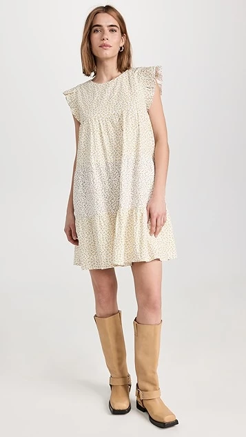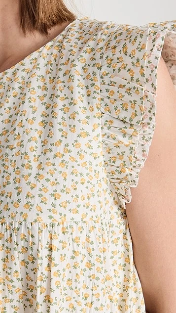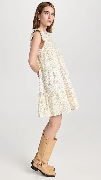 Capture some charming and timeless style for your summertime wardrobe with this English Factory shift dress. This piece spotlights a sunny-hued floral print, and is detailed with pleated ruffles at the shoulders. Complete your outfit with a pair of suede boots.
