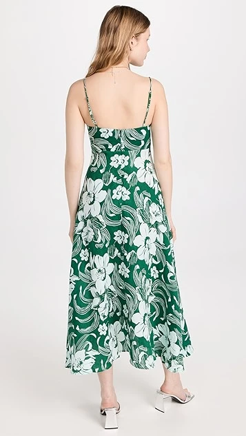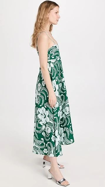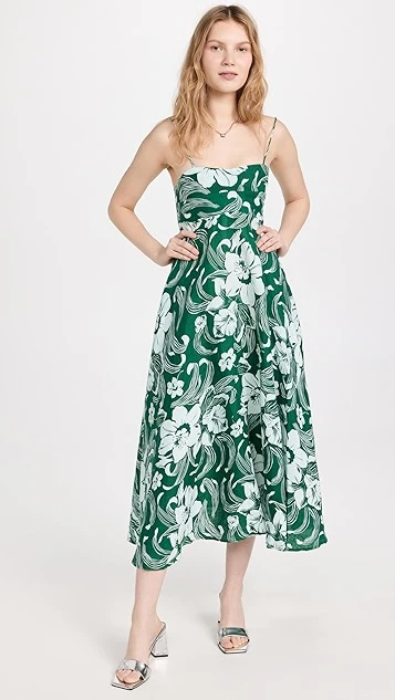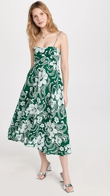An elegant FAITHFULL THE BRAND midi dress with a deep-green floral print and a classic fit-and-flare silhouette. All you’ll need to complete your outfit is the right pair of heeled sandals.