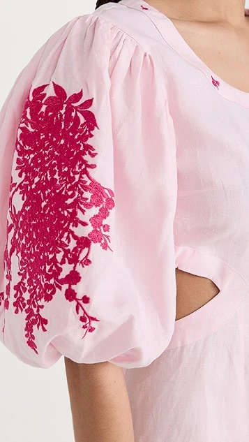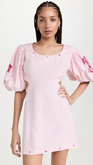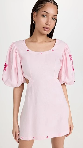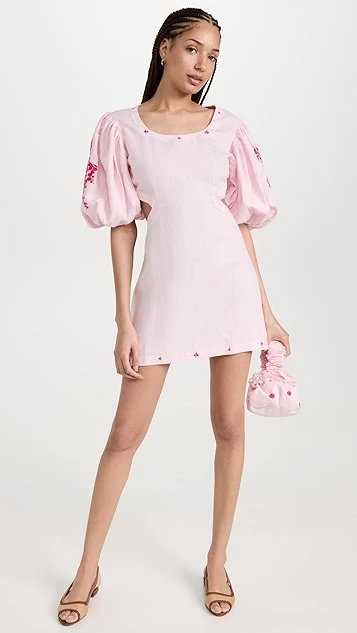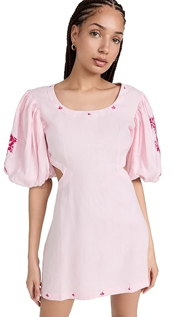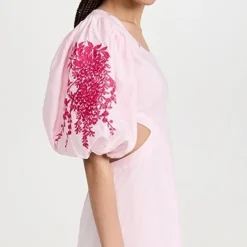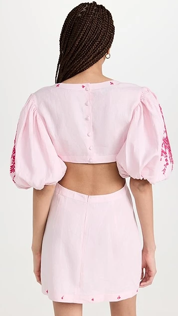 - Scoop neckline and elbow-length puff sleeves