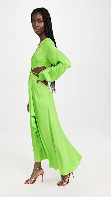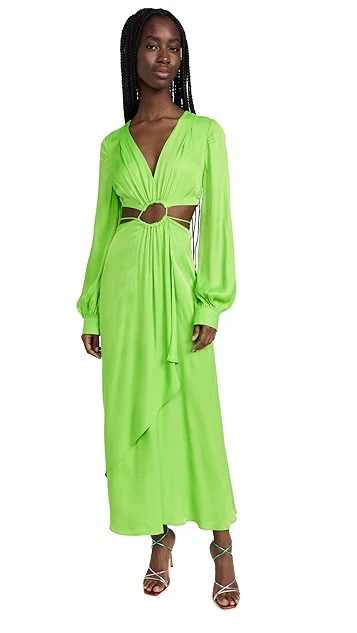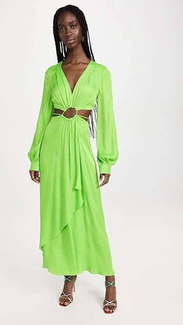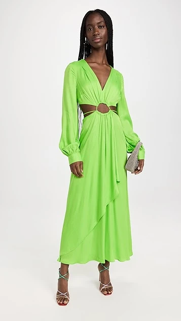 Lovers of vivid color will find a lot to like in this FARM Rio dress, which is crafted from silky, lime-green fabric. A wraparound cutout at the waist and a draped panel at the skirt add an element of elegance to the silhouette. A colorful pair of strappy sandals will suit this piece particularly nicely.