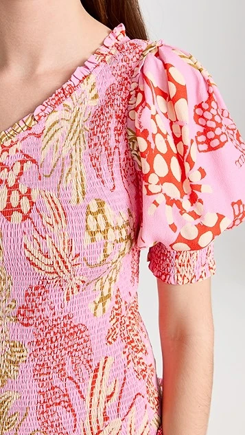 - Smocked elastic bodice and ruffle seams
