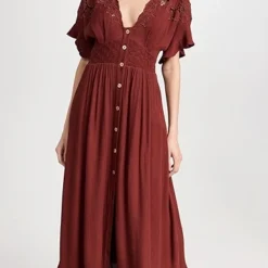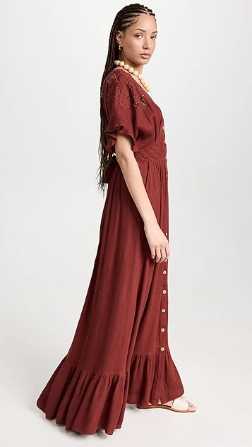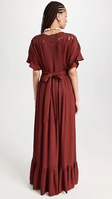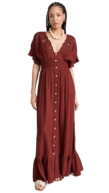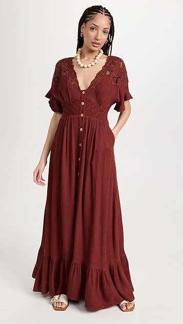 Rich touches of guipure lace embellish the shoulders of this richly textured and romantically colored Free People maxi dress. To accessorize, add a beaded necklace at the scalloped neckline and a favorite pair of sandals.