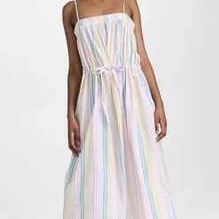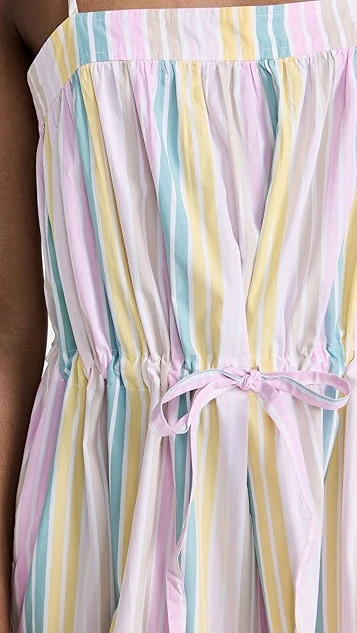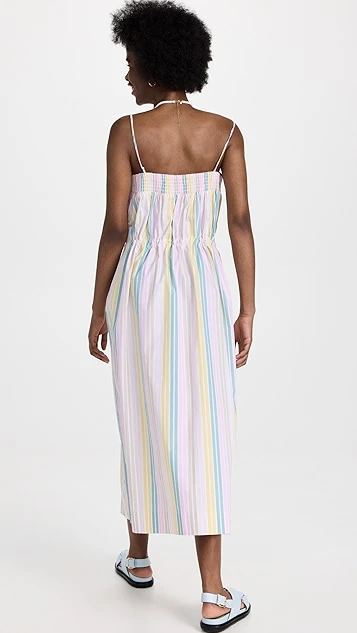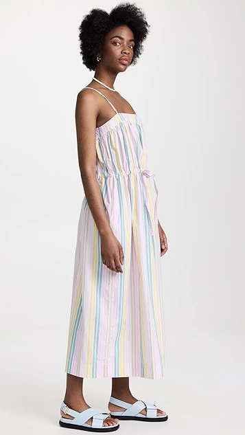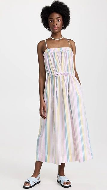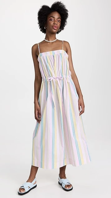 The day dress your spring wardrobe has been missing. This voluminous GANNI dress juxtaposes whisper-thin shoulder straps with a voluminous fit, and is accented with a mix of pastel stripes. Slender inset ties add emphasis to the waist.