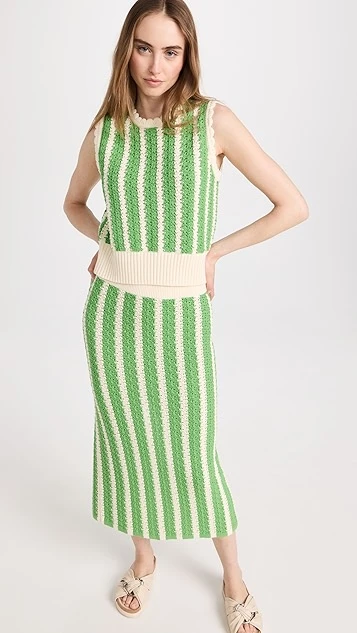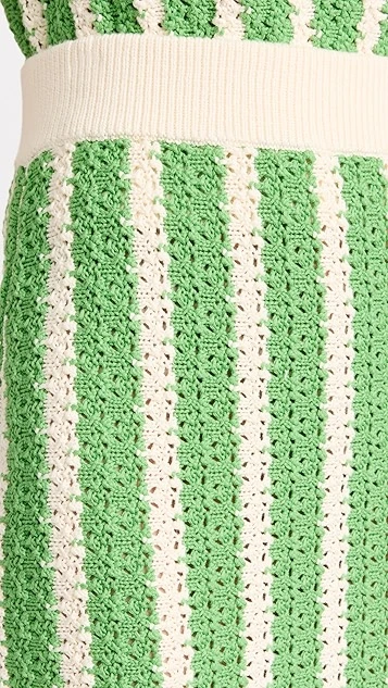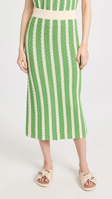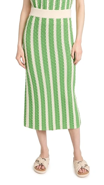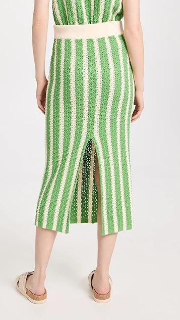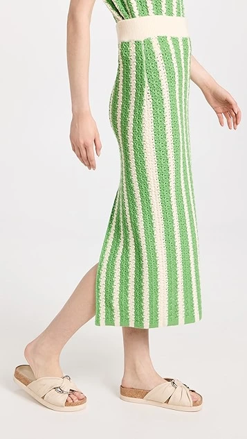 More charming than your usual pencil skirt, this crocheted KITRI midi skirt features a ribbed waistband and an eye-catching arrangement of green stripes. A deep back vent relaxes the hem.