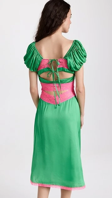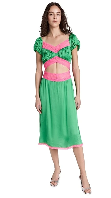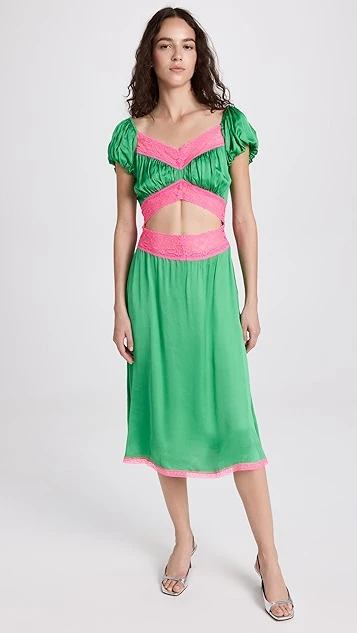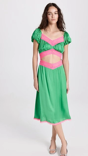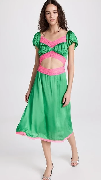 Bright touches of contrast lace accentuate the neckline, waist cutout, and hem of this unique Love The Label dress. To complete your special occasion look, add silver tone sandals and crystal earrings.