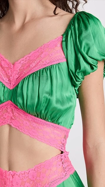 - Cutout waist and V neck with lace trim