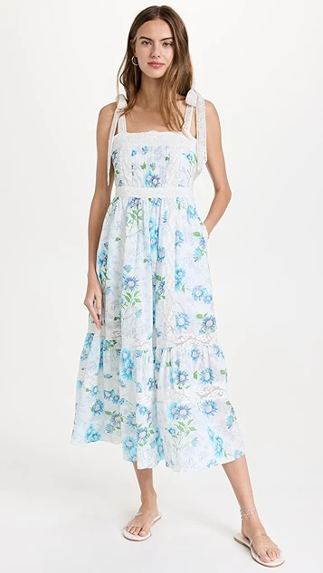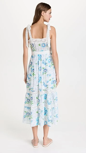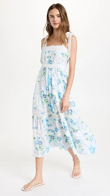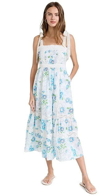 A charming LoveShackFancy dress for summer days, featuring a mix of lovely floral patterning and touches of soft lace. Wear yours with a favorite pair of heeled mules.