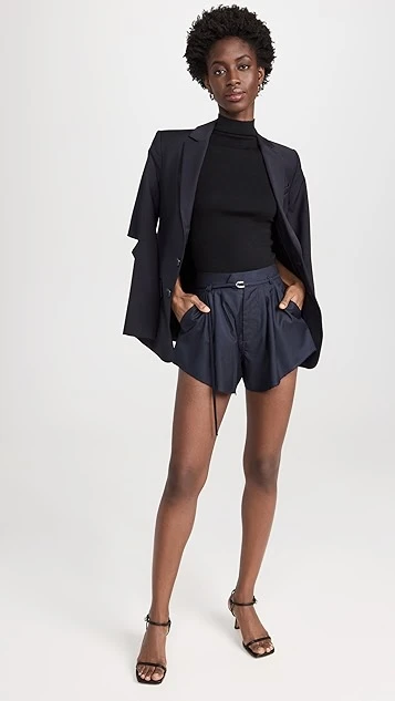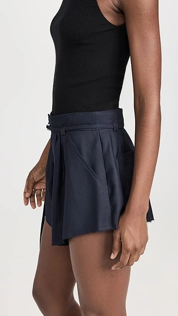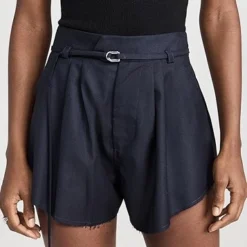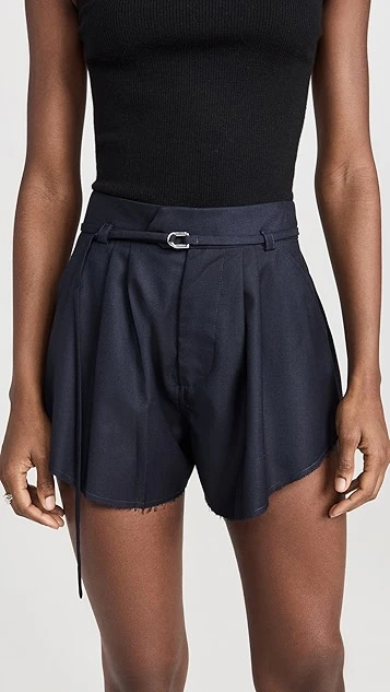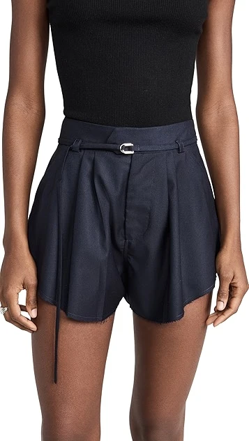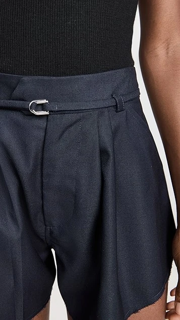 - Pleated design and raw cuffs