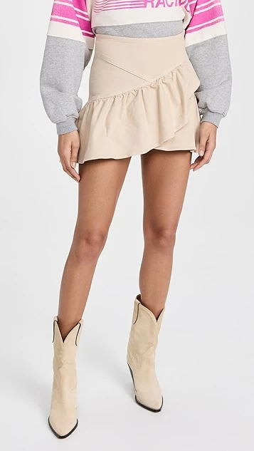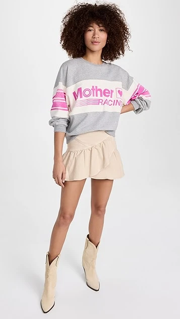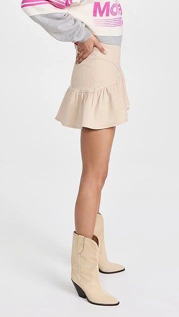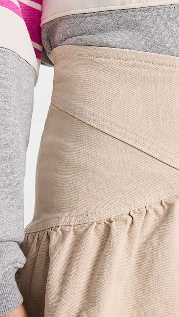 Classic denim gets a pretty makeover, courtesy of MOTHER. Imbued with light color, this charming miniskirt is fitted at the waist, and finishes with a flared and pleated crossover hem.