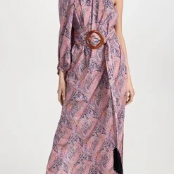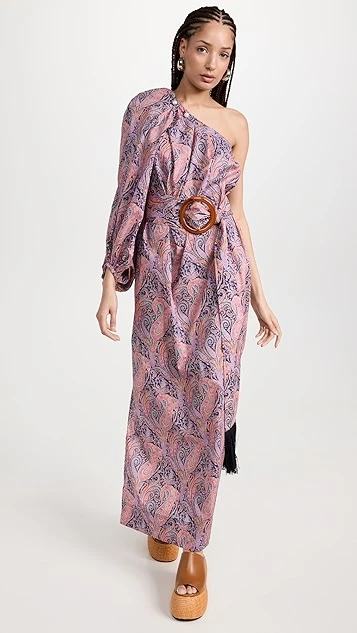 - Self-belt with statement acrylic buckle and fringe trim