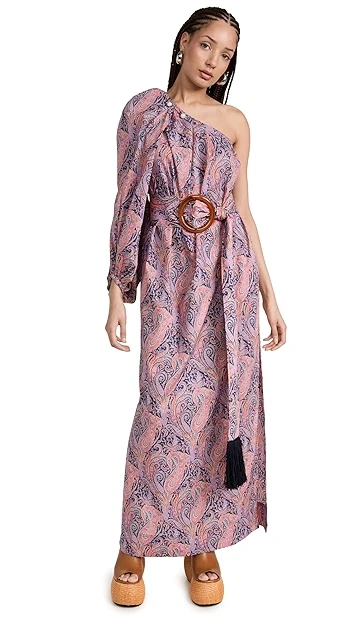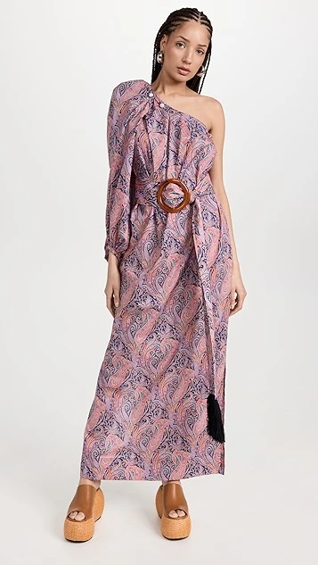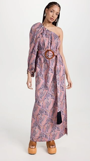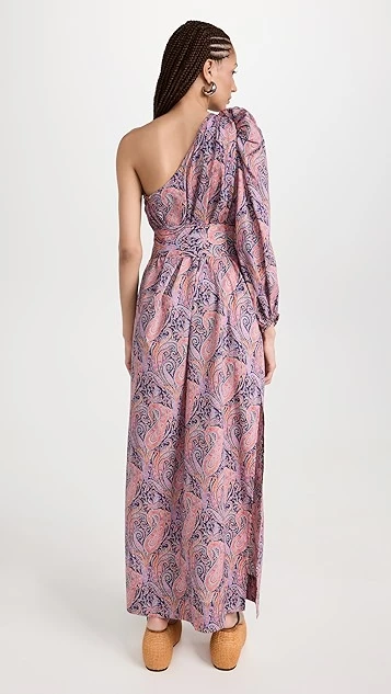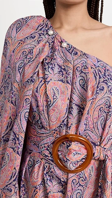 - One-shoulder neckline and single long puff sleeves