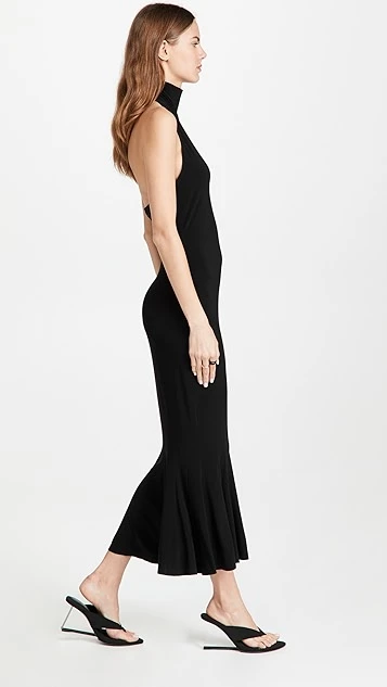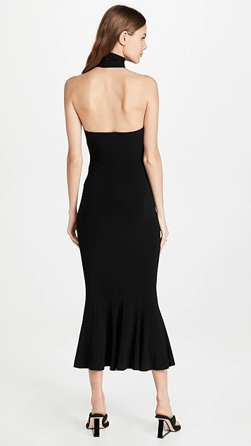 Crafted from soft jersey, this sleek Norma Kamali black dress is as comfortable as it is sophisticated. A pair of understated sandals complements this midi silhouette nicely.