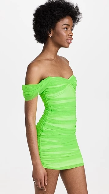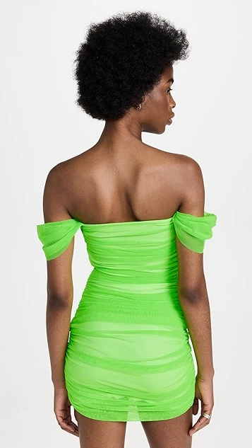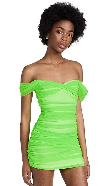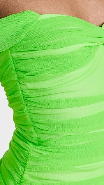 A piece that’s guaranteed to steal the show, this Norma Kamali off shoulder mini dress is crafted from slinky, neon-green mesh. A bandeau bodice and fluid ruching add to the special-occasion feel of the silhouette.