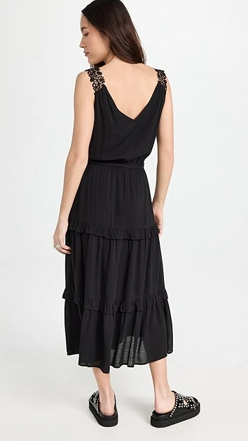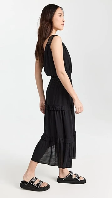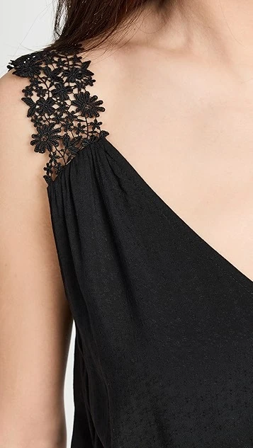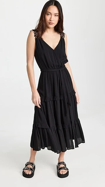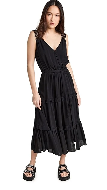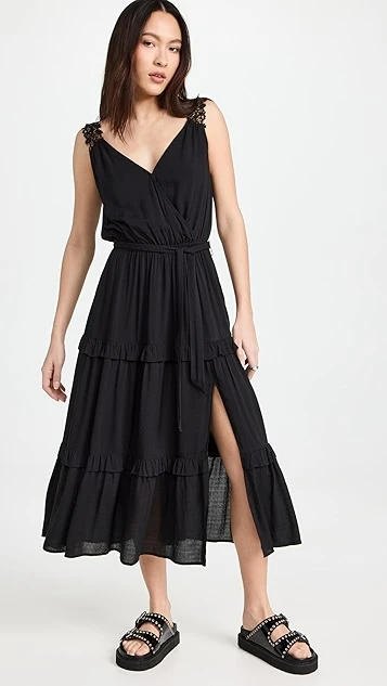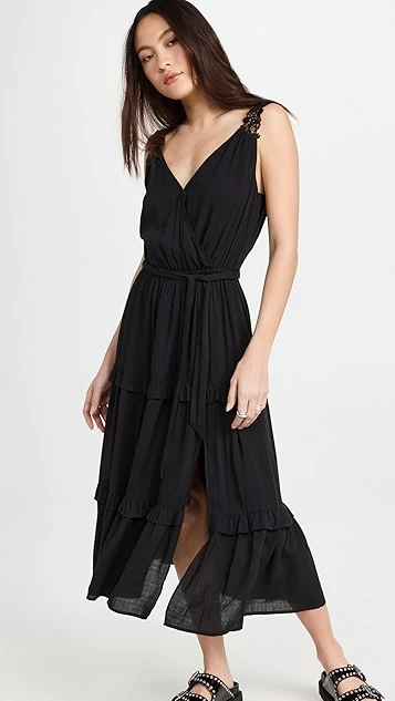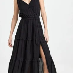 This black PAIGE dress features delicate lace shoulder straps, an elegant thigh-high slit, and a surplice neckline that adds a touch of sophistication to the overall look. It can be paired with high heels and statement jewelry for a formal occasion or dressed down with sandals for a more casual event.