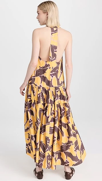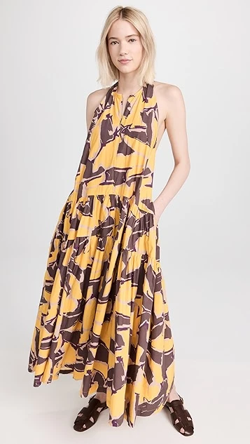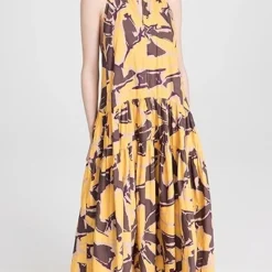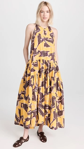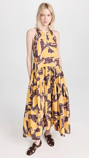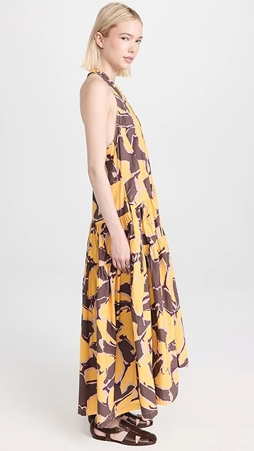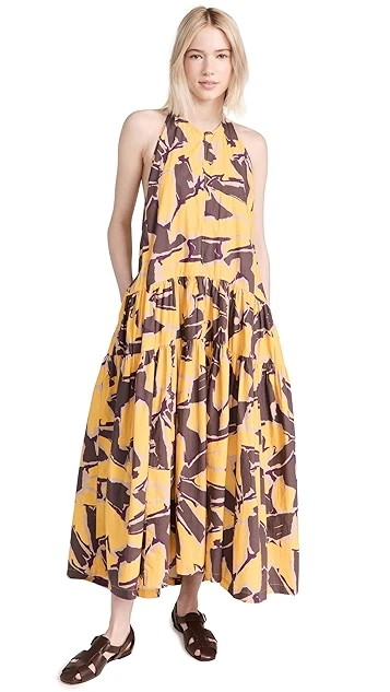 - Curved waist and tiered skirt with ruffle hem