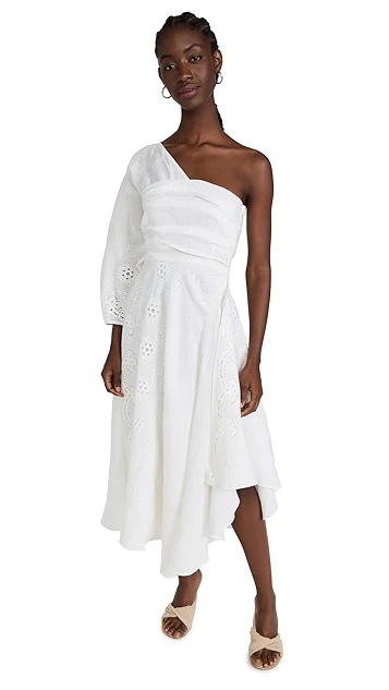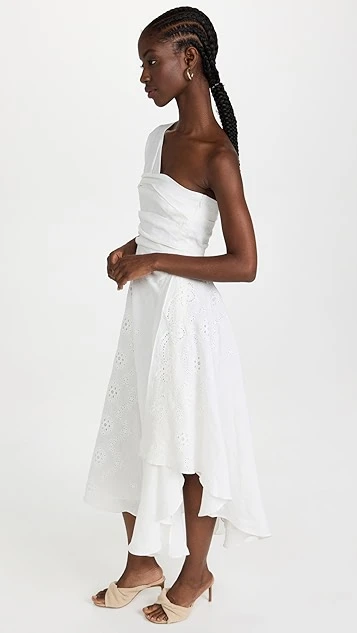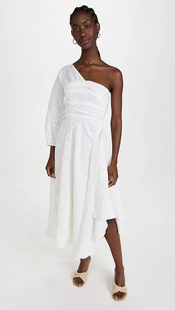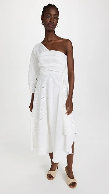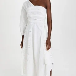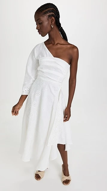 - One-shoulder neckline and single 3/4 length sleeve