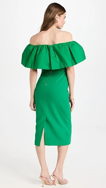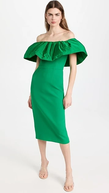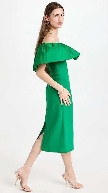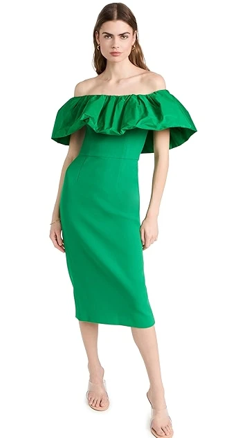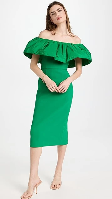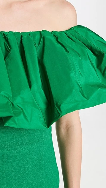 - Off-shoulder neckline with fold-over taffeta ruffle trim