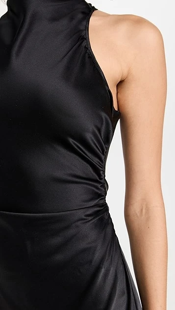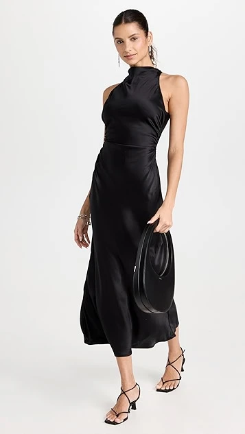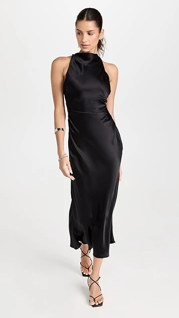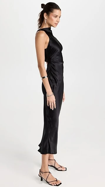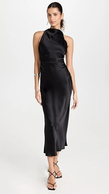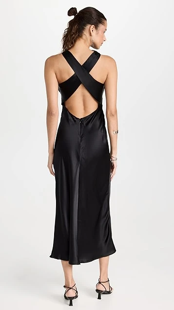 A svelte and sophisticated option for your next big event, this black Reformation dress features pure silk fabric, a fitted cut, and a high neckline. Broad straps crisscross the open back.