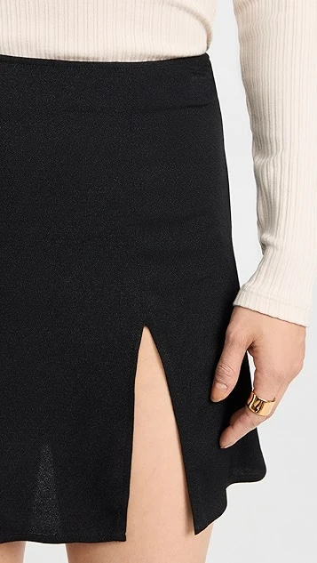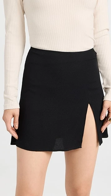 Polished and endlessly versatile, this black Reformation miniskirt features a hem-relaxing slit. It’ll work equally well as part of sporty and polished ensembles.