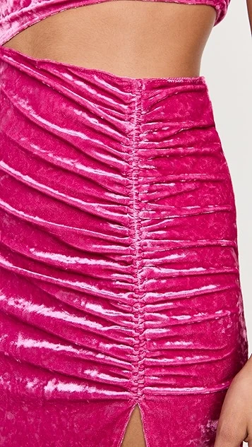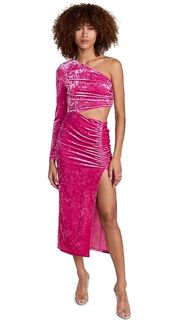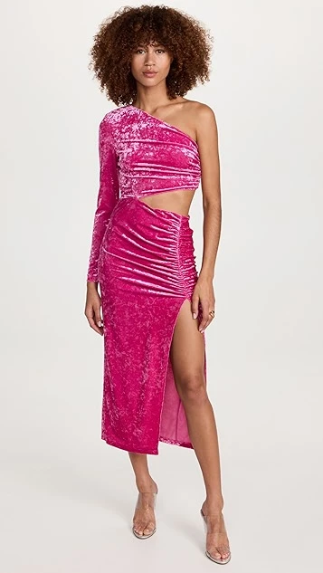 Shimmery, brightly colored velvet composes this occasion-worthy Saylor dress. A waist cutout and one-shoulder neckline add a touch of asymmetry, and a deep slit finishes the silhouette.