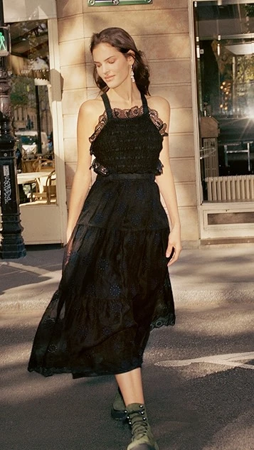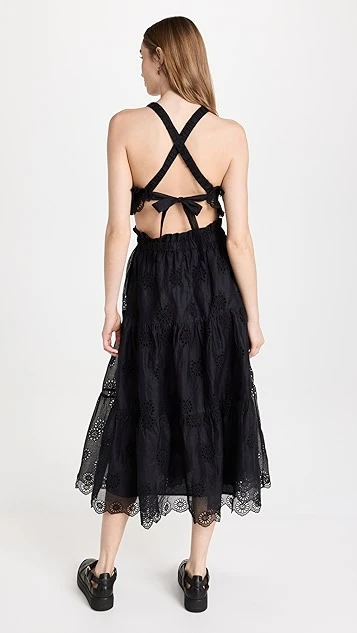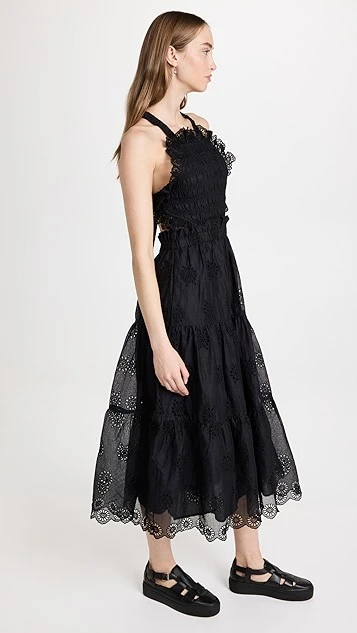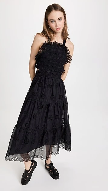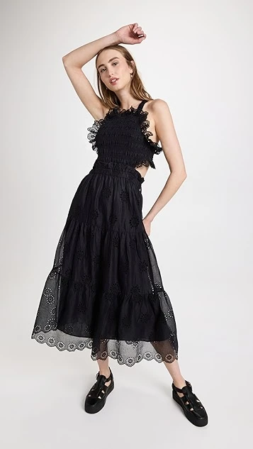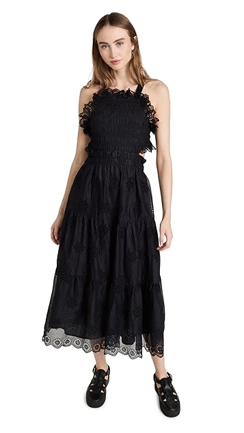 A unique and elegant Sea black dress, crafted from gossamer eyelet fabric and cut in a classic fit-and-flare silhouette. This Blaine dress gains a further touch of elegant style from a smocked and ruffle-trimmed bodice and a strappy open back. Tonal shoes, from sandals to kitten heels, provide an ideal finishing touch for this piece.