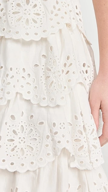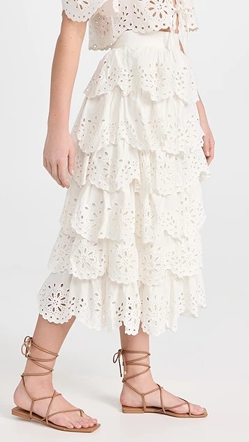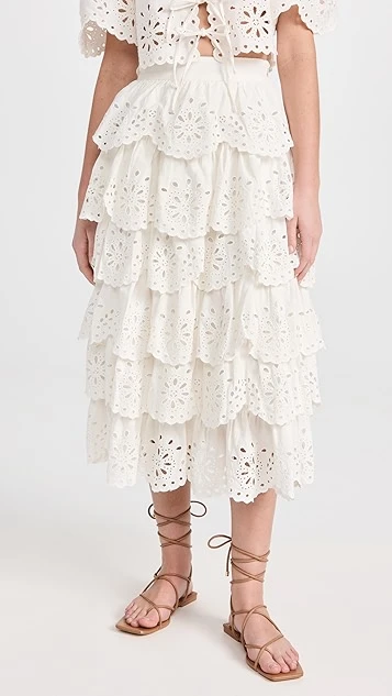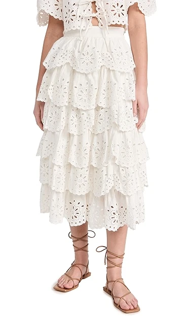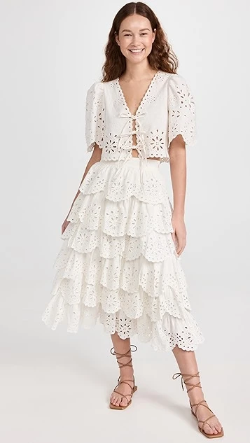 Elaborately tiered, scalloped, and detailed, this Sea white skirt is a pretty-as-a-picture pick for summer days, especially when it’s paired with the label’s coordinating top.