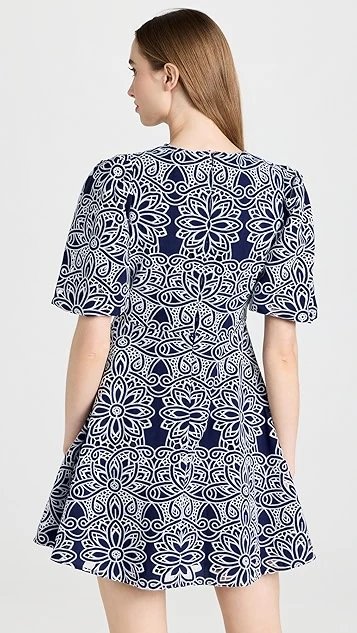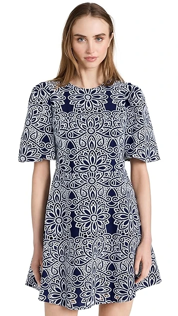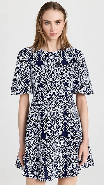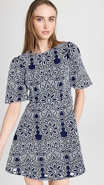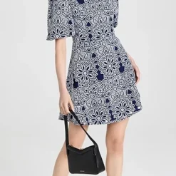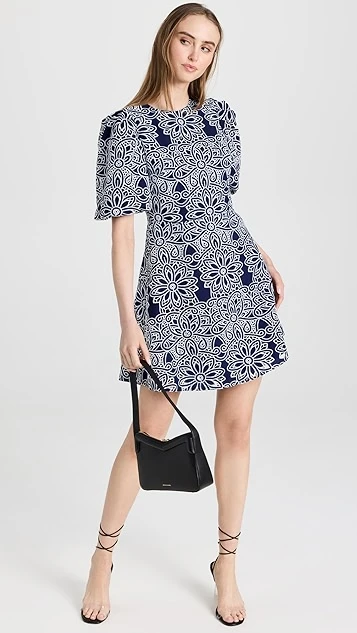 This Shoshanna dress is sure to captivate thanks to a dense geometric print. A subtle A line skirt brings a touch of extra volume to the silhouette. Round out your look with strappy sandals and a black leather bag.