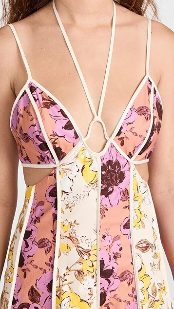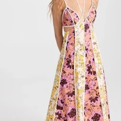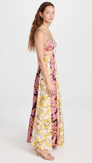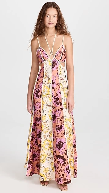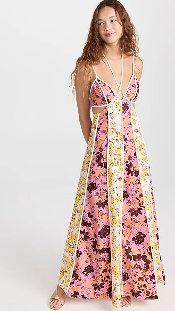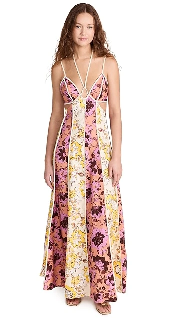 You’ll be sure to make an impression in this Significant Other maxi dress, thanks to its deep, strappy neckline, wraparound waist cutout, and paneled mix of floral patterns. Complete your outfit with understated kitten heels to give this piece the spotlight it deserves.
