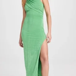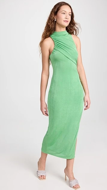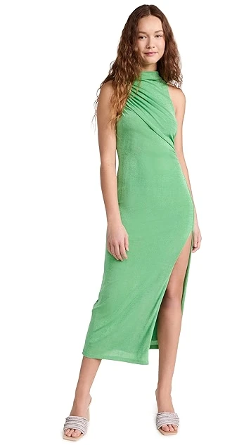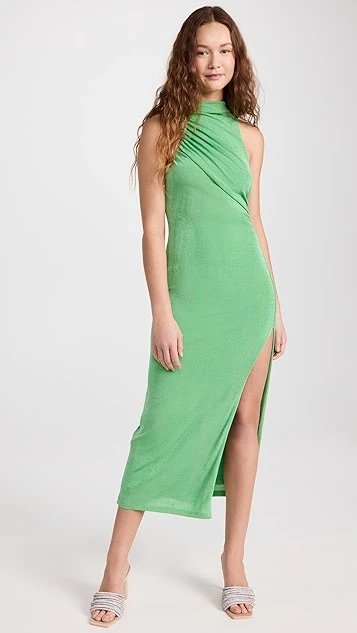 A unique Significant Other midi dress with special occasion potential, featuring a shimmery metallic sheen, a mock neckline, and asymmetrical ruching. A thigh-high slit relaxes the hem and adds a touch of extra allure.