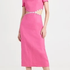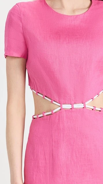 Pink linen composes this sleek and unique STAUD dress, which is accented with contrast cords that accentuate its cutout waist. Wear yours with a pair of heeled sandals from the label’s collection.