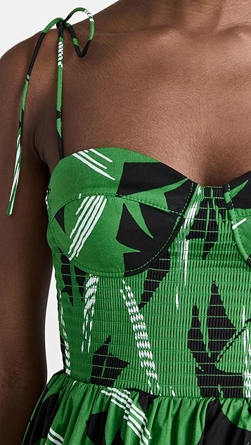 This vividly patterned STAUD mini dress juxtaposes a formfitting bustier bodice with a flared skirt for a classic fit and flare look. Wear yours with a dark pair of kitten heels, and accessorize with gold-tone jewelry.