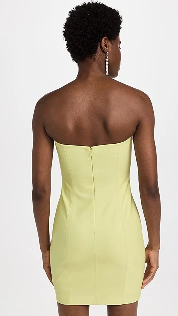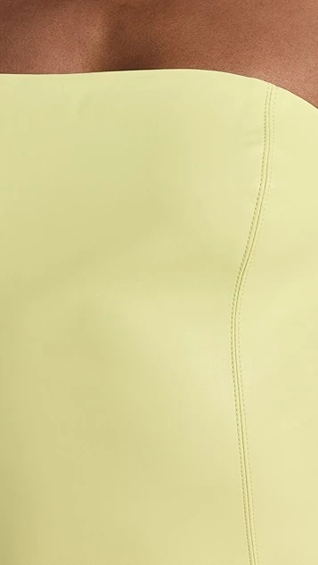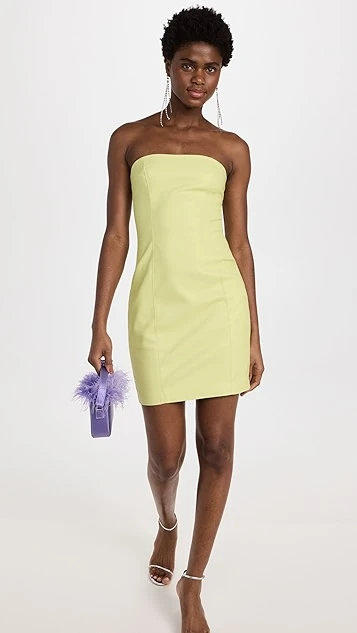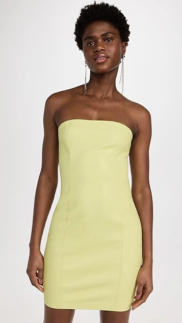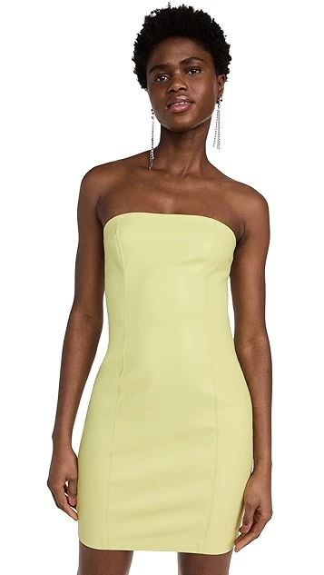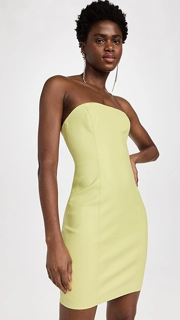 An occasion-worthy Susana Monaco strapless dress, composed of light-colored faux leather. Accessorize with a statement clutch, and complete your outfit with the heeled sandals of your choice.
