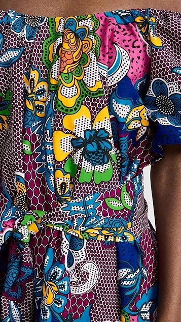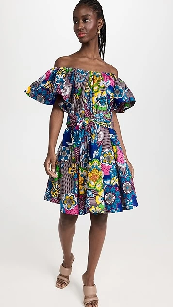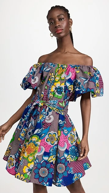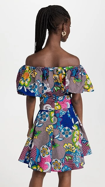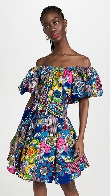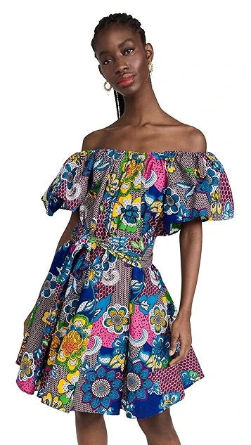 Crafted from structured poplin and enhanced with a floral honeycomb print, belt, and off-shoulder neckline with voluminous flutter sleeves, this the Oula Company dress is a bold piece for sunny days. Go with understated sandals to give it the spotlight it deserves.