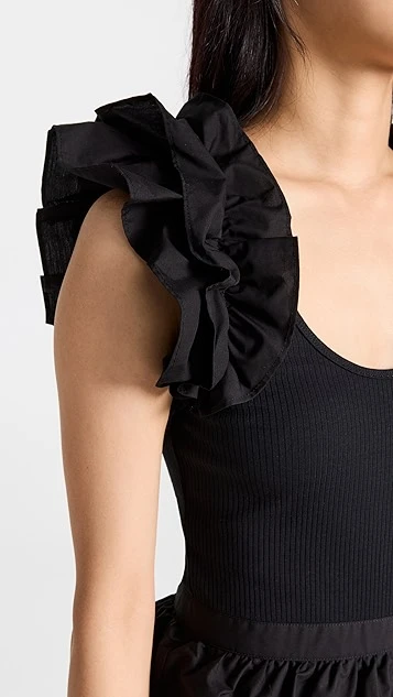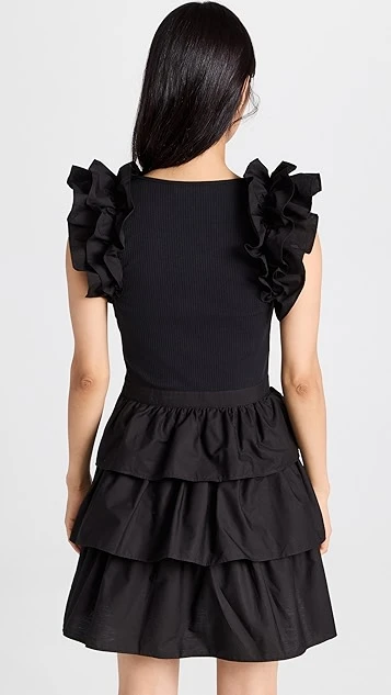 Go from day-to-night with easy in this mixed-media little black dress from Ulla Johnson. This piece juxtaposes a slim bodice in ribbed jersey with a tiered skirt and shoulder ruffles in crisp poplin. Complete your outfit with the heeled sandals of your choice.